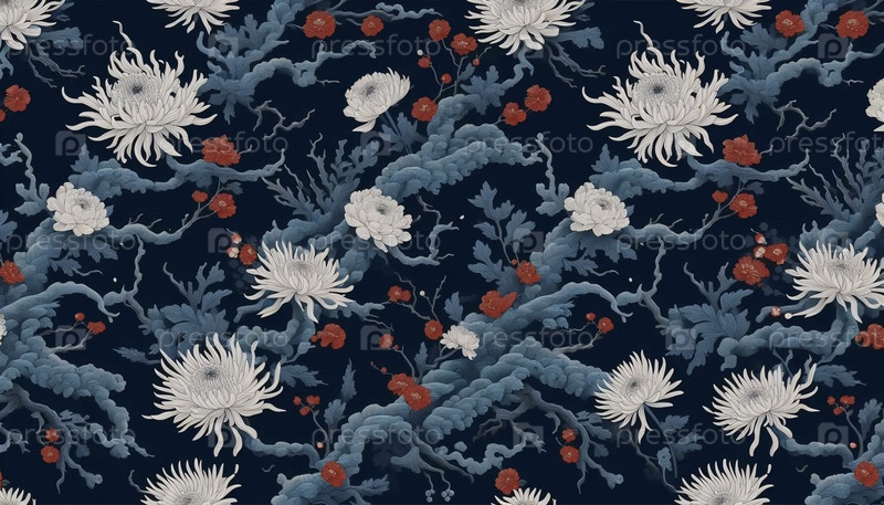 Японский цветочный рисунок темно-синий коралловый дизайн без швов, Ai generated image