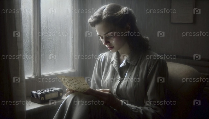 Женщина читает любовное письмо времен войны у окна, Ai generated image