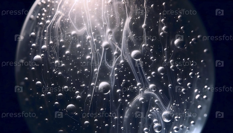 Макромокап несовершенного, вручную продуваемого стекла, показывающий захваченные пузырьки воздуха и вращающиеся органические формы с обратным освещением