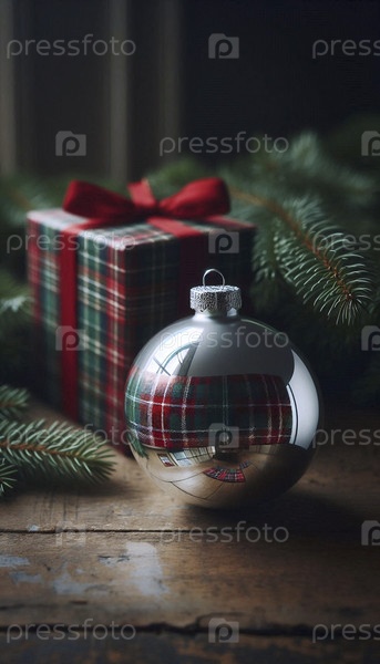 Мокет праздничного украшенияПростой, пустый стеклянный мокет расположен рядом с упакованной в тартан подарочной коробкой на камине, Ai generated image