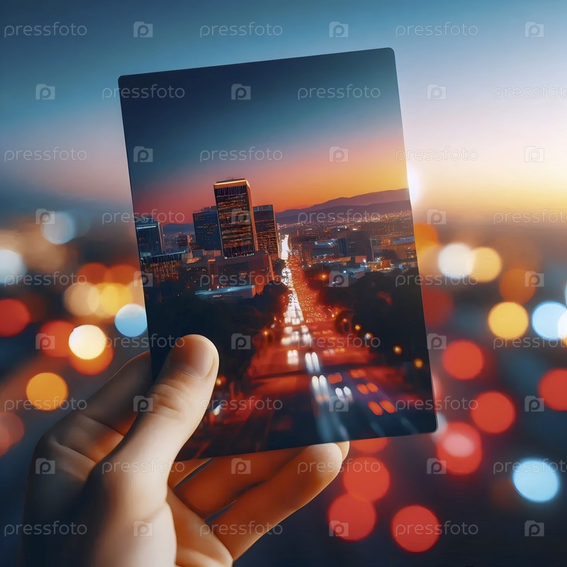 Мокет почтовой карты с глянцевым отделением, удерживаемый между большим и указательным пальцами на фоне боке городского пейзажа, Ай создал изображение