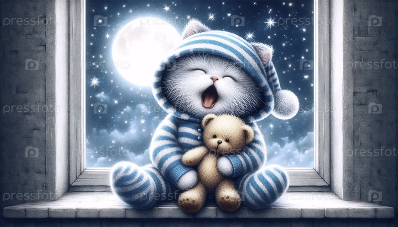 Спящая кошка в пижаме рассказ перед сном искусство, Ai generated image