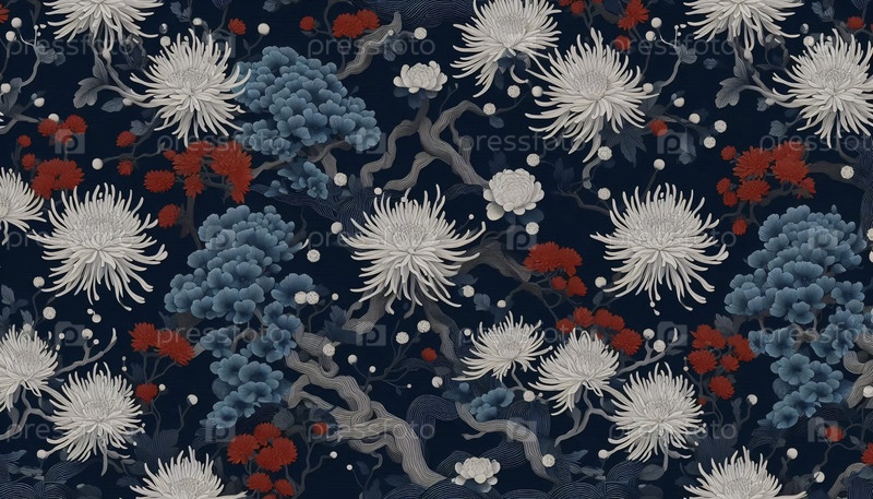 Японский цветочный рисунок темно-синий коралловый дизайн без швов, Ai generated image