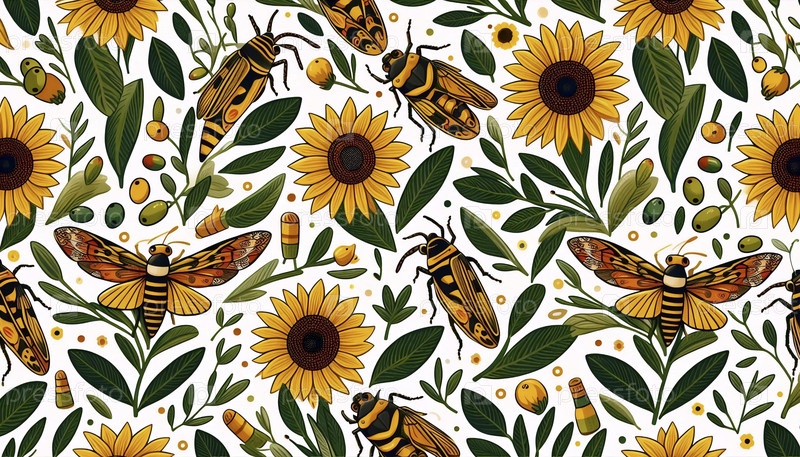 Бесшовный рисунок французской провансальной цикады и подсолнечника, Ai generated image