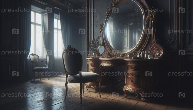 Более широкий снимок, включающий пыльное зеркало, отражающее пустой стул, Ai generated image