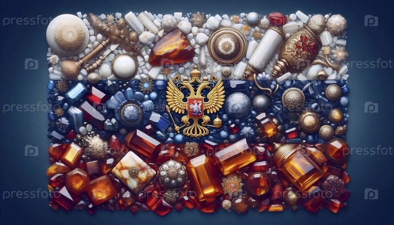 Российский флаг в янтаре и золотых сокровищах, Ai generated image