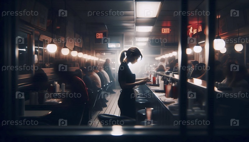 Более широкий снимок оживленной закусочной, которую можно увидеть через дверь, ее уединенный момент, Ай создал изображение