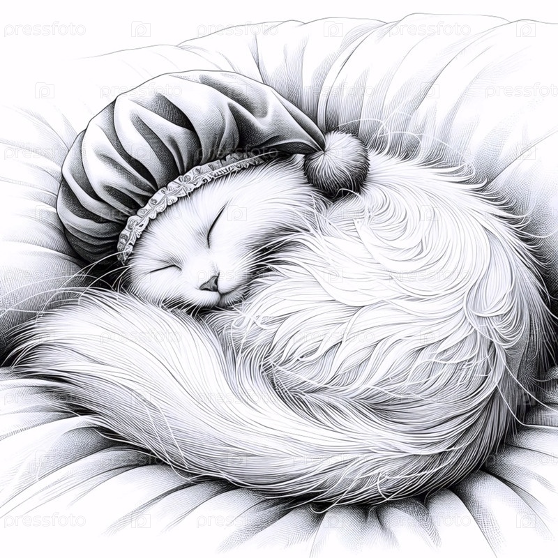 Минималистский линейный рисунок спящей кошки в ночной шляпе, Ai generated image
