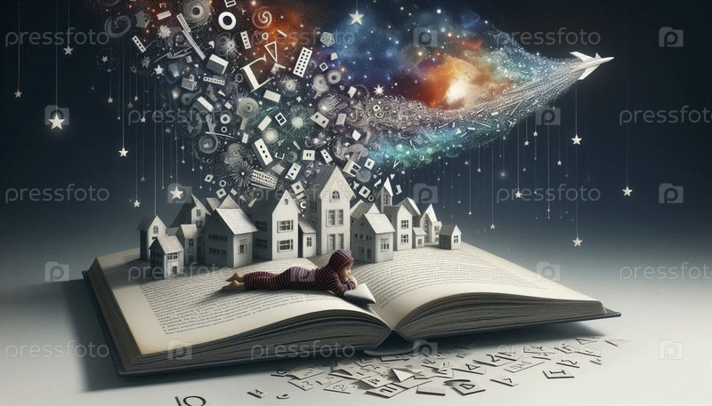 Мечтательная иллюстрация ребенка, летящего на книге, Ai generated image