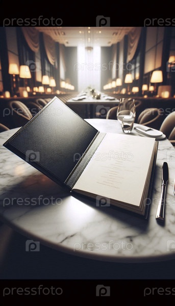 Пустой макет меню ресторана, покрытый кожей, открыт на мраморной столовой поверхности, Ai generated image
