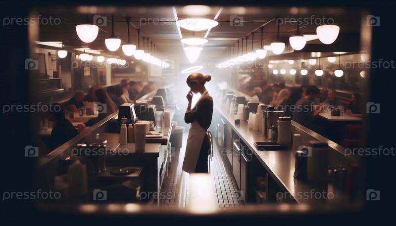 Более широкий снимок оживленной закусочной, которую можно увидеть через дверь, ее уединенный момент, Ай создал изображение