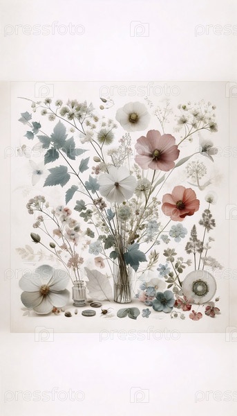 A dried flowers herbarium art print, Ai generated image А сушеные цветы гербария художественная печать, Ай создал изображение