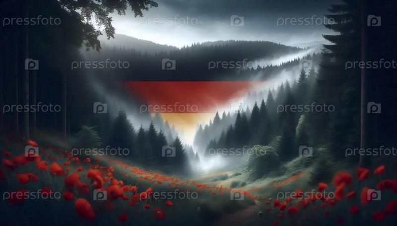 Немецкий флаг в Черном лесу - сказочный пейзаж, Ai generated image