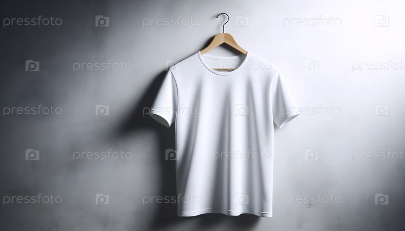 Простой белый макет футболки на простом деревянном вешальнике, против бетонной стены, Ai generated image