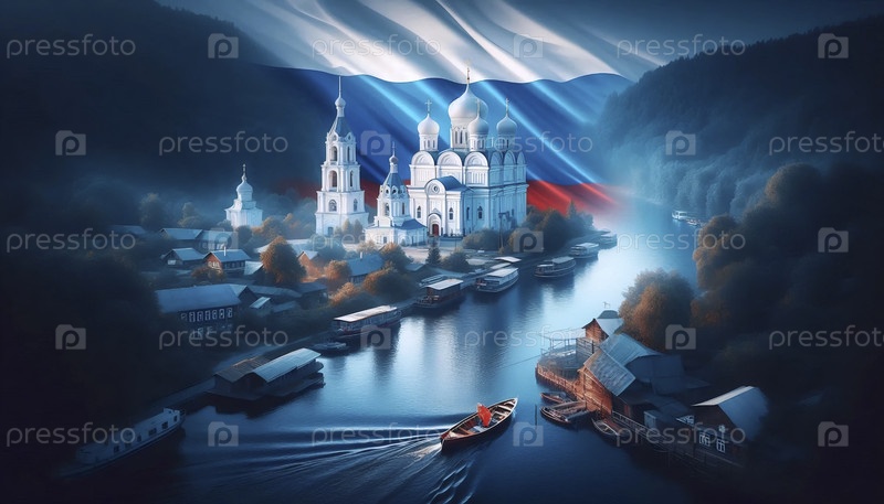 Российский флаг на Волге и пастырская жизнь, Ai generated image