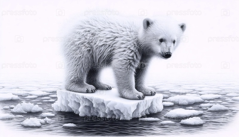 Малыш белого медведя на льду чернила рисование арт-принт, Ai generated image