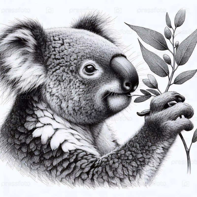 A Koala with a Eucalyptus Leaf ink drawing art print, Ai generated image Коала с эвкалиптическим листом чернил рисование художественная печать, Ай создал изображение