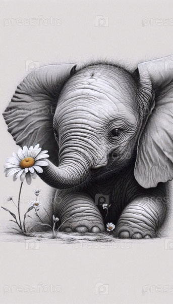 Маленький слон держит цветочную чернила художественная печать, Ai generated image