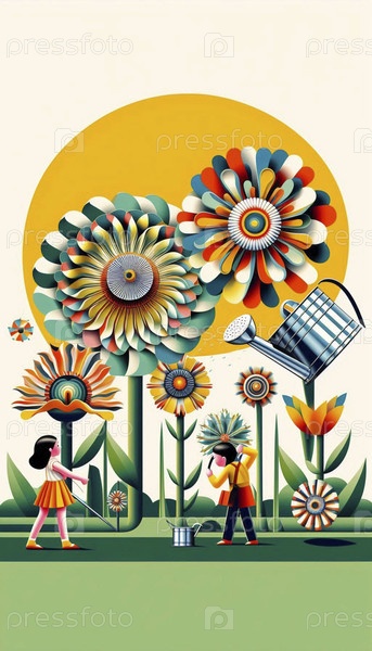 Дети поливают гигантские геометрические цветы, Ai generated image