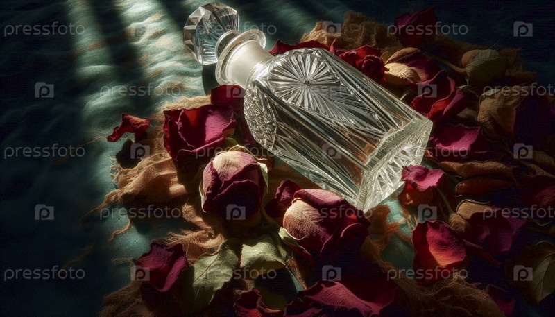 Макет пустой кристаллической бутылки, наполовину похороненной в постели сушеных листьев роз, Ai generated image