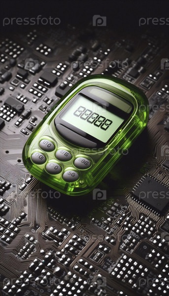 Полупрозрачный зеленый макет пейджера на текстуре платы с микросхемой, со светящимися цифрами LCD, Ai generated image