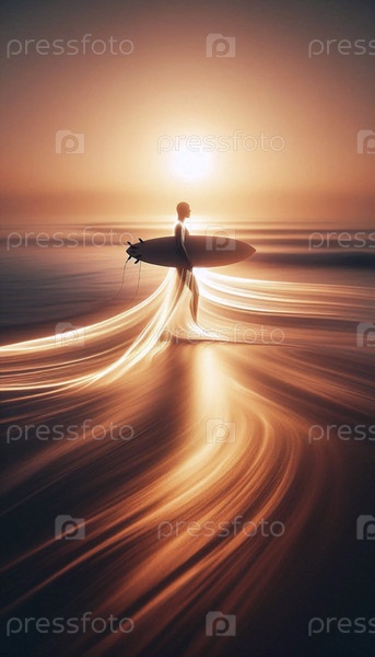 Фотография с длительной экспозицией серфера, идущего в океан на рассвете, Ai создала изображение