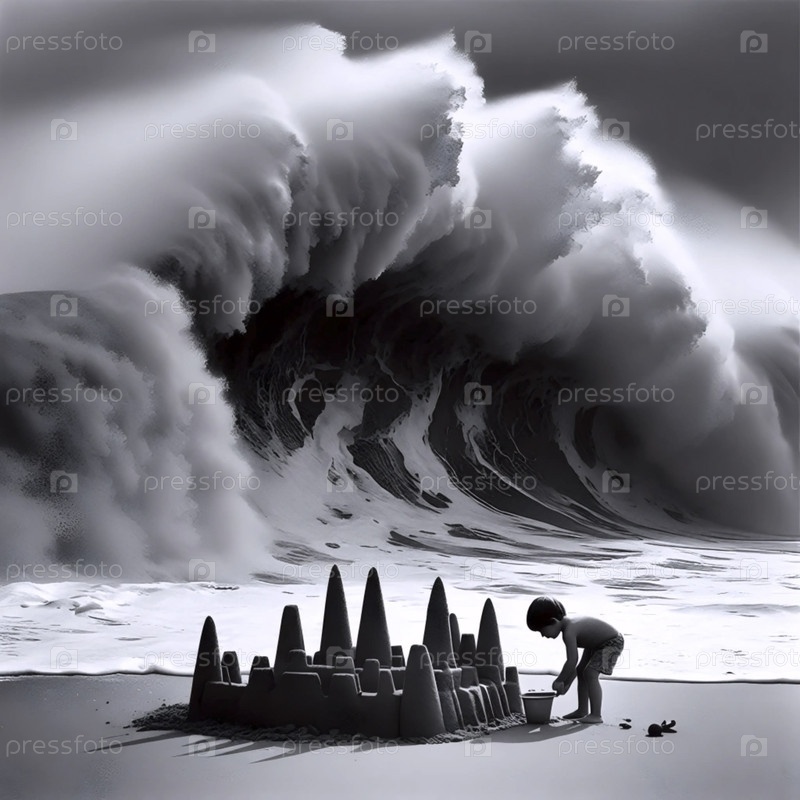 Ребенок, строящий крепость песчаного замка против надвигающегося прилива, Ai generated image