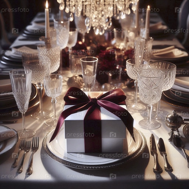 Простой белый макет подарочной коробки с широкой меховой лентой, расположенной посреди богато установленного праздничного обеденного стола перед прибытием гостей, Ai generated image