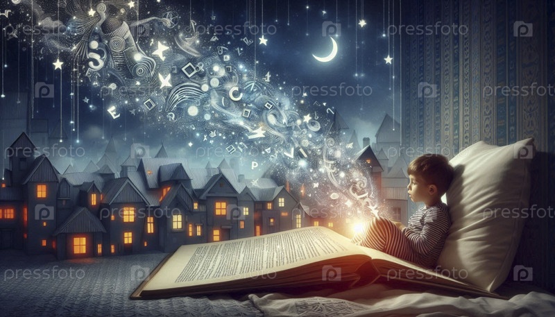 Мечтательная иллюстрация ребенка, летящего на книге, Ai generated image