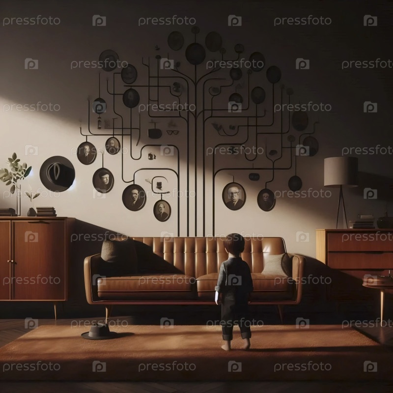 Ребенок смотрит на стилизованную стену семейного дерева, Ai generated image