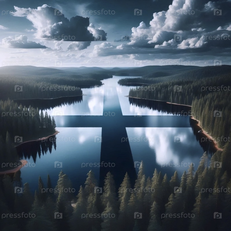 Флаг Финляндии в лесном озере отражение, Ai generated image A