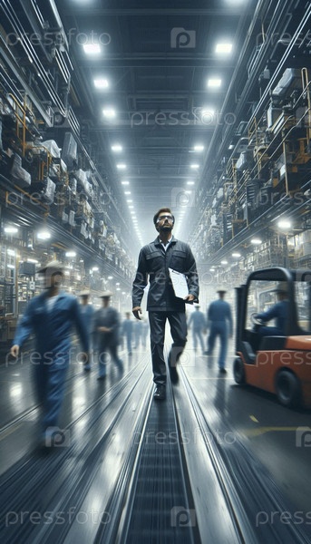 Более широкий кинематографический снимок окружающей среды, сделанный на хаотичном заводском этаже, заполненном машинами во время смены смен, Ai генерирует изображение