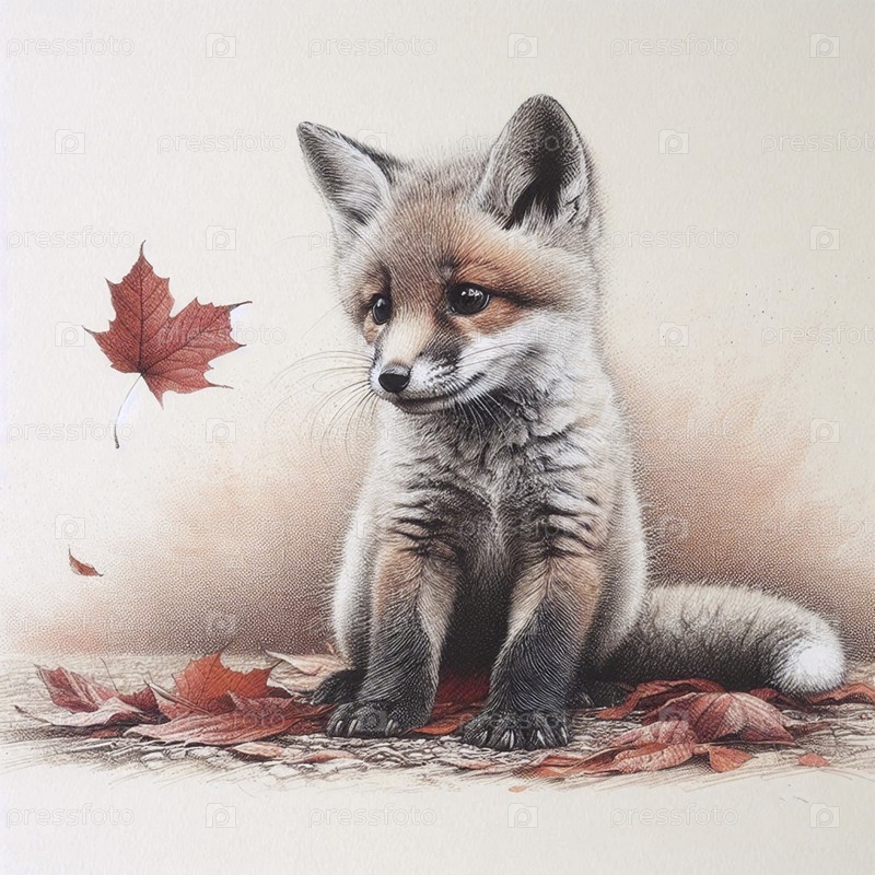 Лисичье детеныше с падающим чернилом листьев рисует художественный принт, Ai generated image