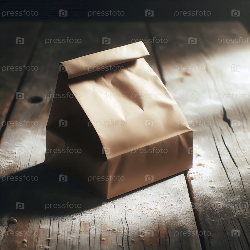 Плоский, пустой макет хлебных пакетов из коричневой бумаги со сложенным верхом на выветрившейся деревянной поверхности Ai generated image
