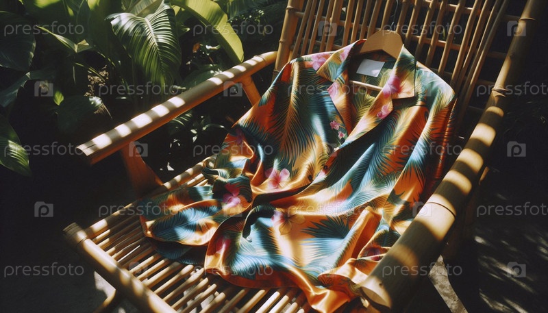 Макет рубашки с коротким рукавом в печатном шелке, расстегнутой и положенной над бамбуковым стулом, Ай создал изображение