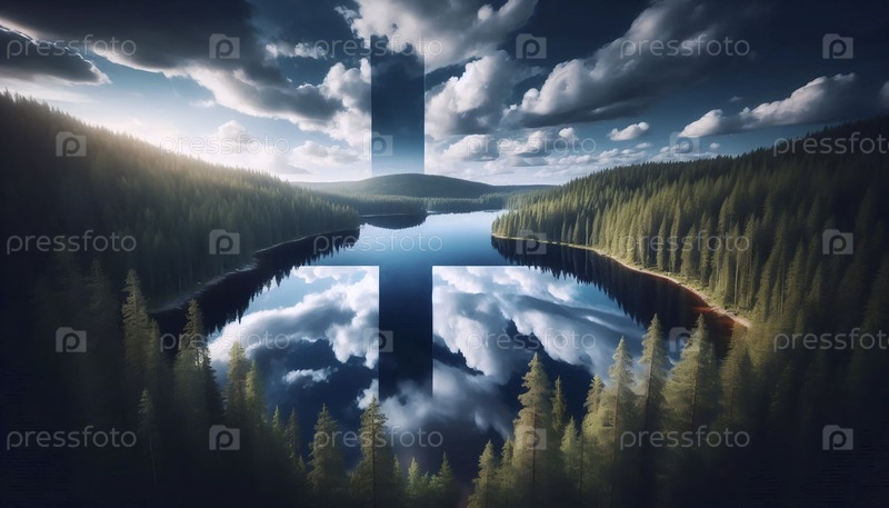 Флаг Финляндии в лесном озере отражение, Ai generated image A