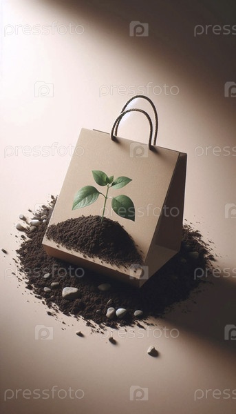 Макет плоского, переработанного бумажного торгового пакета с простым саженцем, растущим в углу на почвенном поле, Ai создал изображение