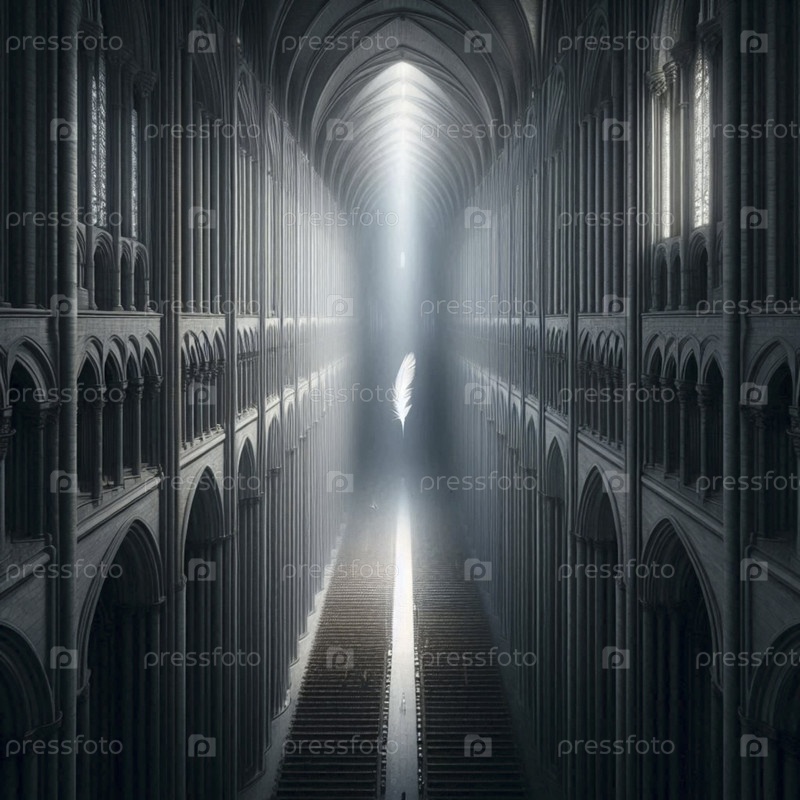 Одно перо, подвешенное от луча света в темном соборе, Ai создало изображение