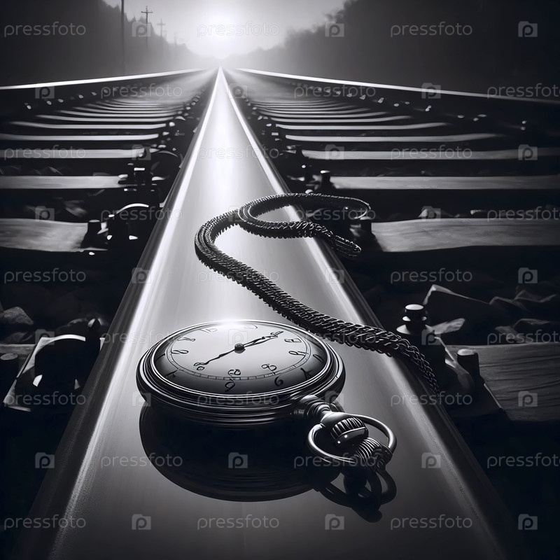Карманные часы на цепи, оставленные на железнодорожных путях, Ai generated image