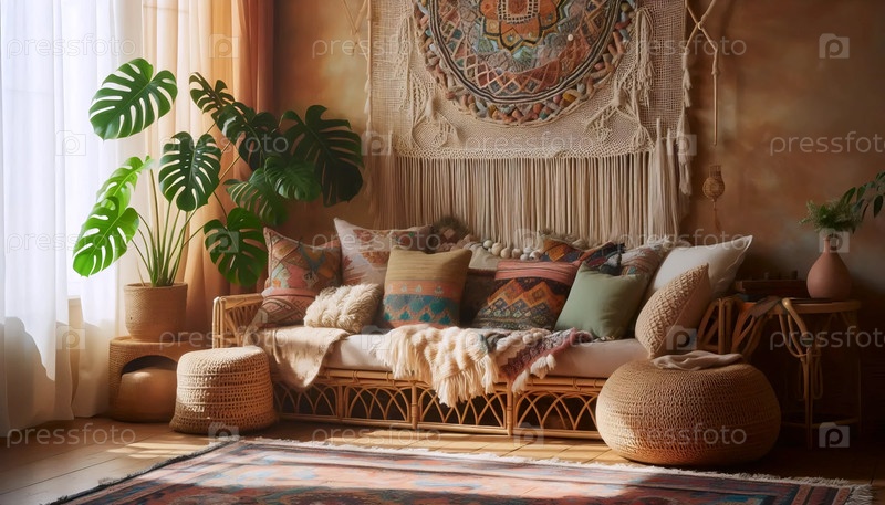 Интерьер гостиной Boho, Ai generated image