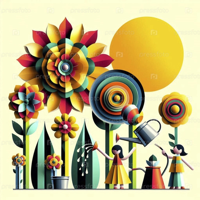 Дети поливают гигантские геометрические цветы, Ai generated image
