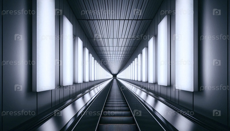 Вертикальный последовательный макет панели проходит рядом с пустым движущимся эскалатором на современной станции метро, Ai generated image