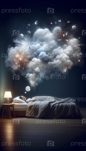 Облако снов, плавающее над спящей женщиной, Ai generated image