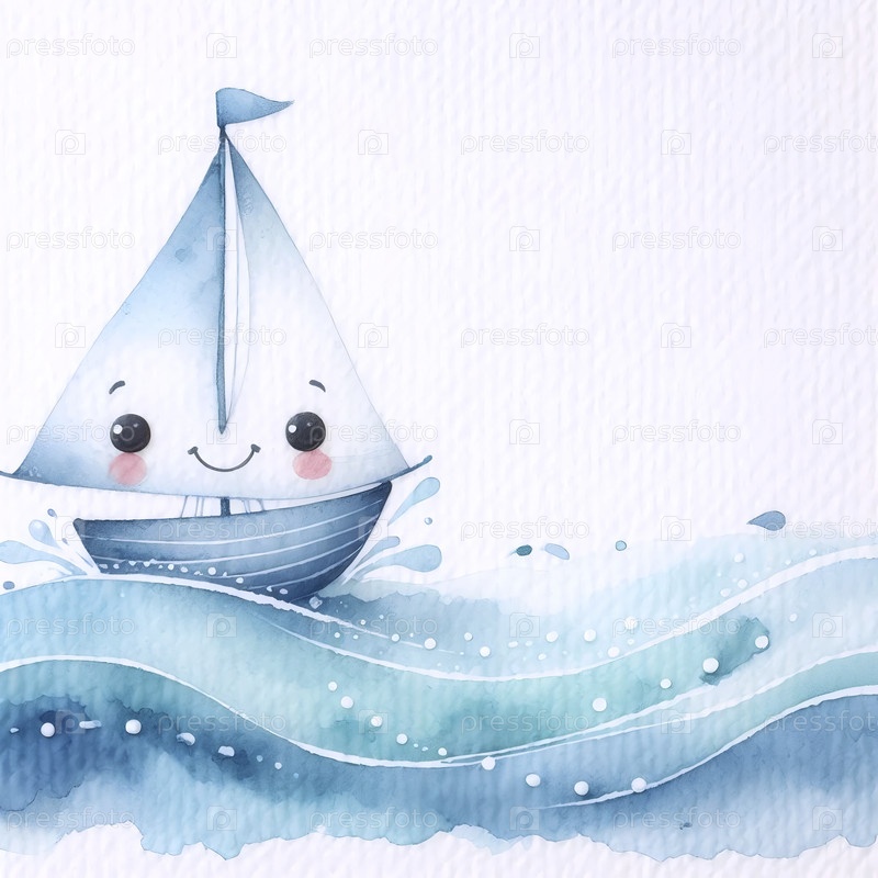 Небольшая парусная лодка на волнах акварельный арт-принт, Ai generated image