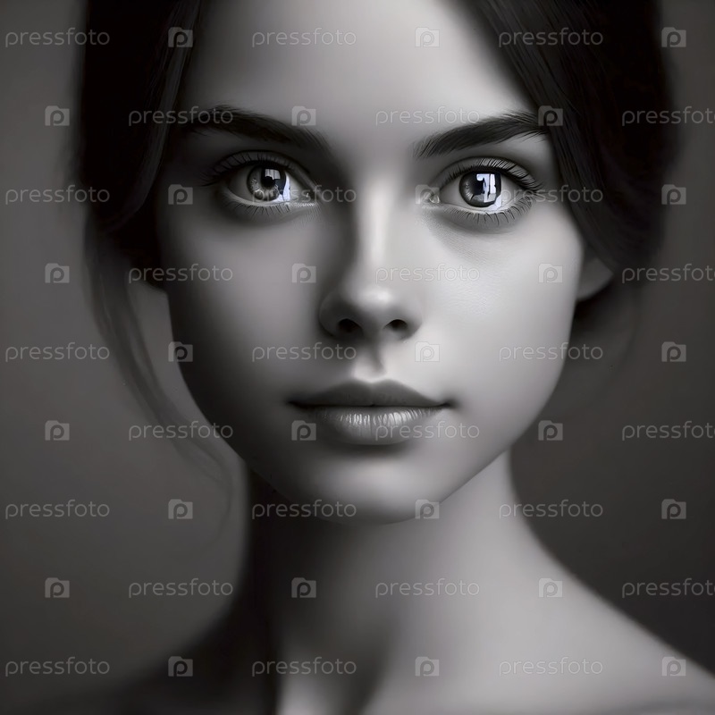 Классический, формально составленный три четверти портрет, где молодая женщина смотрит прямо вперед с нейтральным