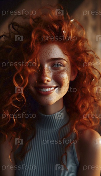 Портрет рыжеволосой с веснушками в золотое время, Ai generated image