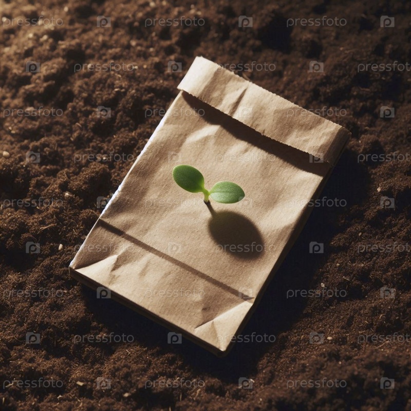 Макет плоского, переработанного бумажного торгового пакета с простым саженцем, растущим в углу на почвенном поле, Ai создал изображение