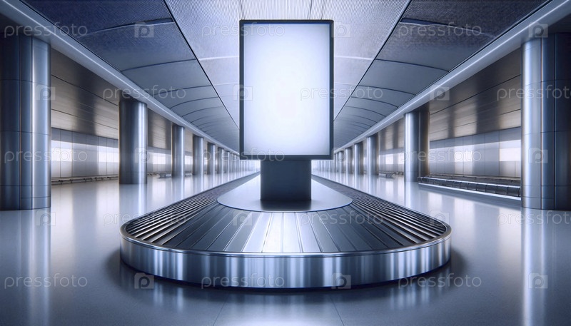 Выгнутый панорамный рекламный макет-панел расположен над пустой багажной каруселью аэропорта, Ai generated image