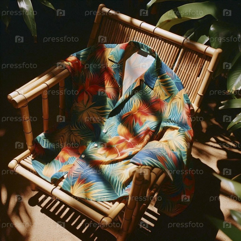 Макет рубашки с коротким рукавом в печатном шелке, расстегнутой и положенной над бамбуковым стулом, Ай создал изображение