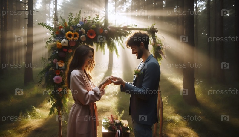 Интимная церемония микро-свадьбы на лесном поле, Ai generated image
